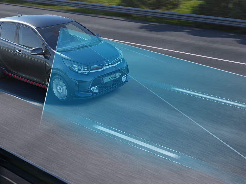 Der Spurfolgeassistent (Lane Following Assist, LFA)⁴ erkennt Fahrbahnmarkierungen und Fahrzeuge auf der Straße. Er unterstützt dich beim Lenken und hält deinen Picanto mittig in der Spur.